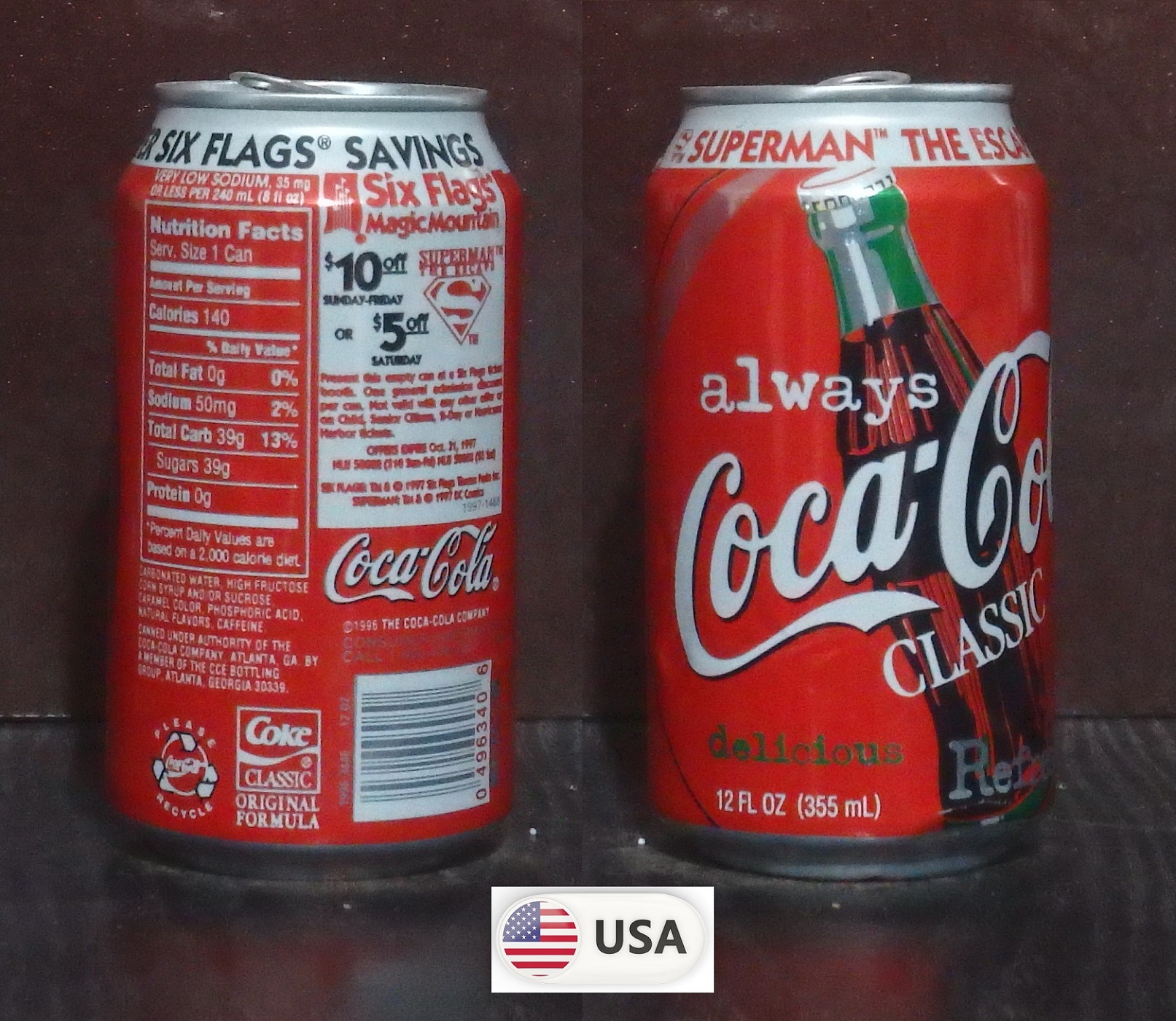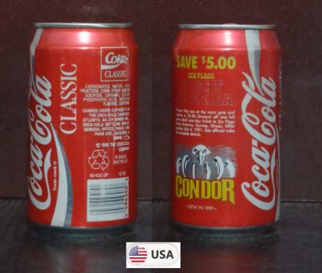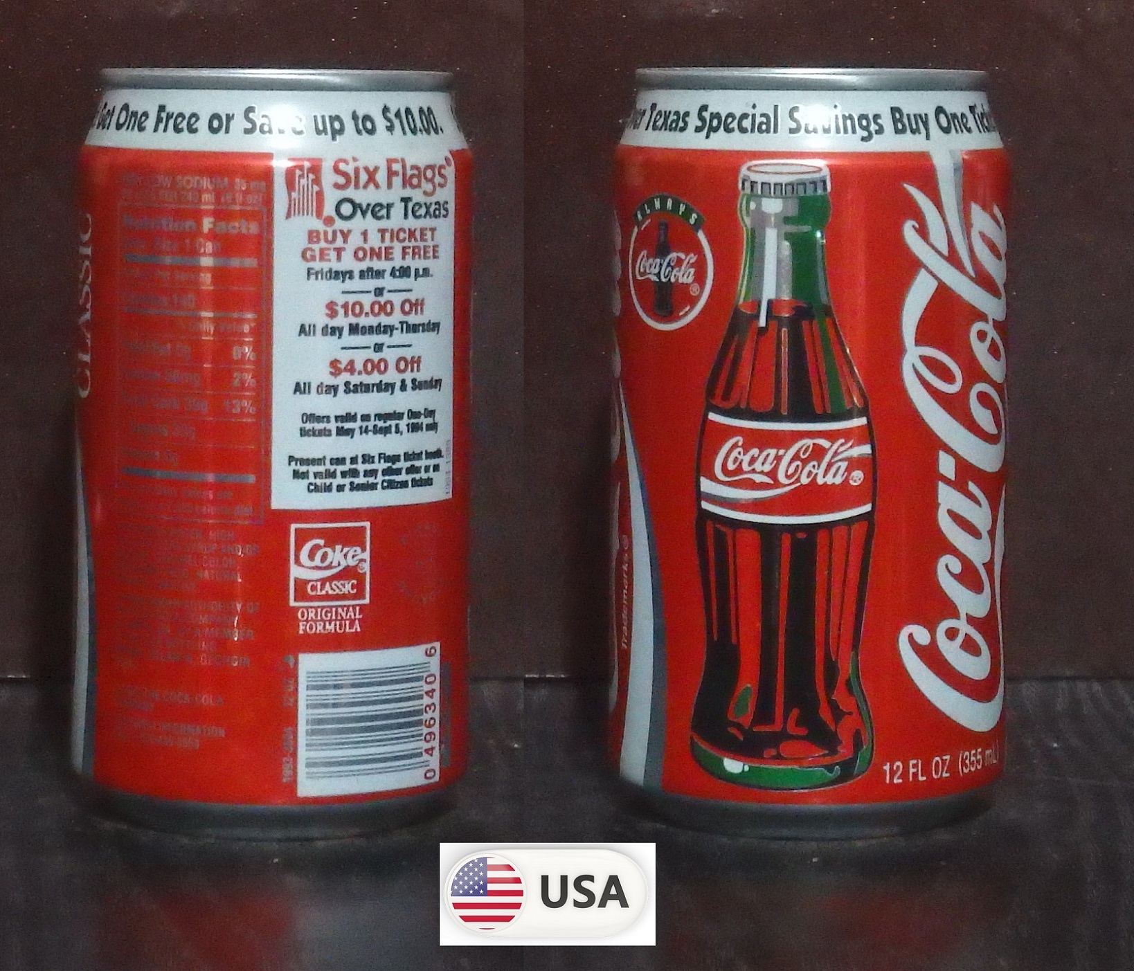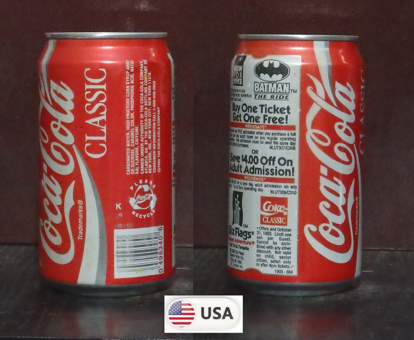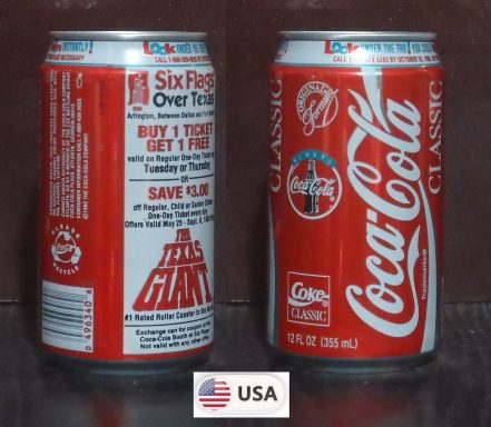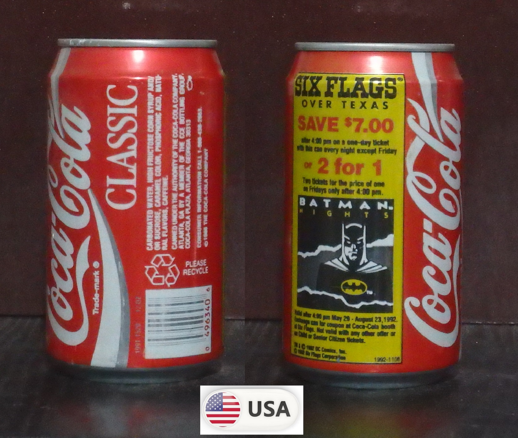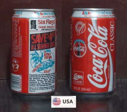 1992 Coke Classic 'Six Flags over Texas - Save $7 Batman Nights' 355ml
